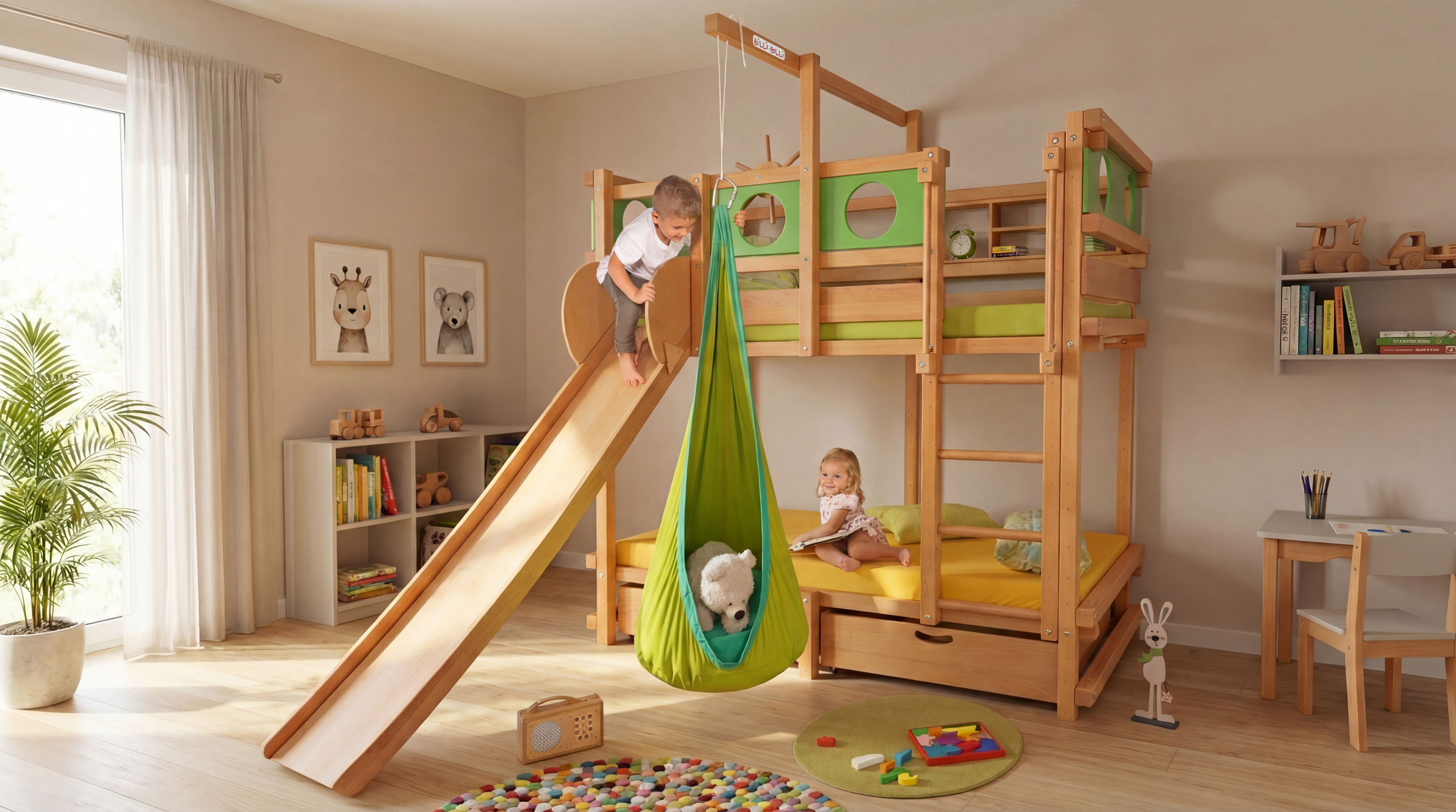 Das Etagenbett für 2 schafft mit den beiden übereinanderliegenden Schlafebenen ausreichend Raum zum Schlafen, Spielen, Toben für Ihre zwei Helden und das auf einer Stellfläche von gerade mal 2 m². Dazu eröffnen sich Ihnen unzählige Möglichkeiten, um das Etagen-Kinderbett mit unserem umfangreichen Bettenzubehör zu einem fantasievollen Spielbett oder Abenteuerbett auszubauen. Zum Beispiel können Sie das Etagenbett mit einer Rutsche ausstatten (wie auf dem Foto gezeigt).