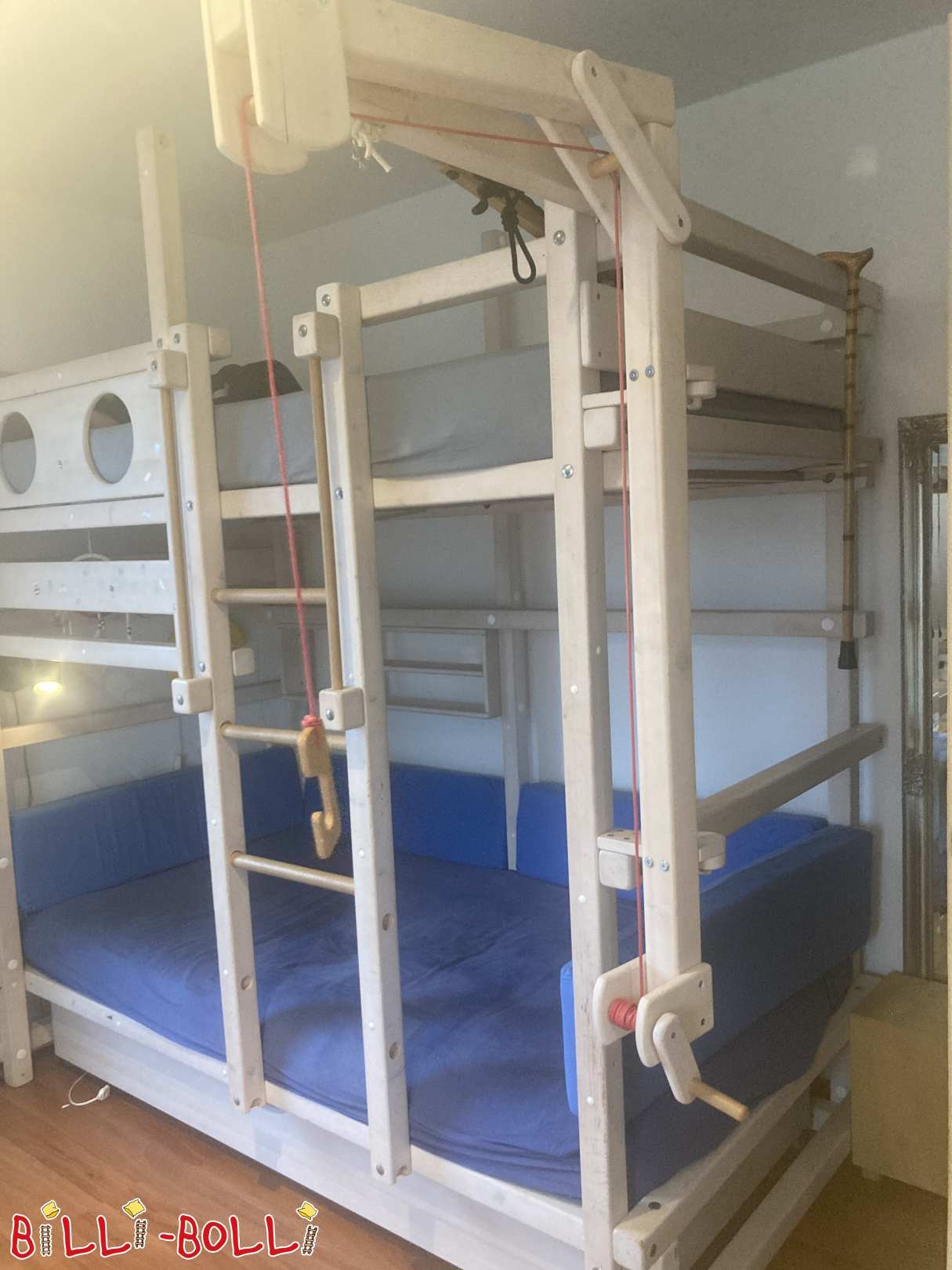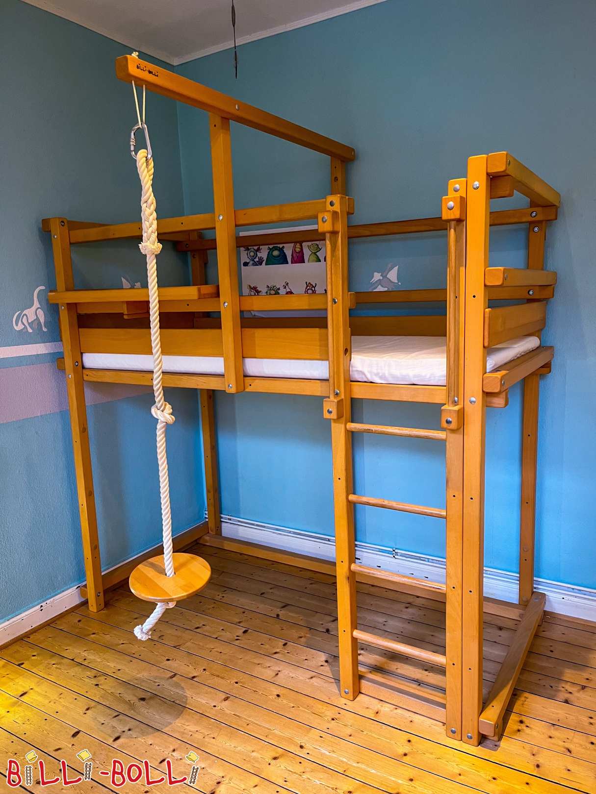 Sehr gut erhaltenes, mitwachsendes Hochbett in Buche geölt-gewachst; das Bett steht seit dem Kauf im Sommer 2016, wurde also nicht umgezogen etc. und hat keinerlei Schäden durch Verunreinigung;der Leitereinstieg kann mit dem Leitergitter abgesichert werden;runde Leitersprossen (angenehm für Kinderfüße);das kleine Regal bietet wertvolle Abstellmöglichkeiten für Wecker, Bücher und dergleichen, als auch für besondere ‚Schätze‘;inklusive Kletterkarabinerhaken XL1 CE 0333 und der zugehörigen Seilchen, als auch der für das Segel;am Schaukelbalken kann auch eine Hängehöhle (nicht enthalten) direkt in den Karabinerhaken eingehängt werden;