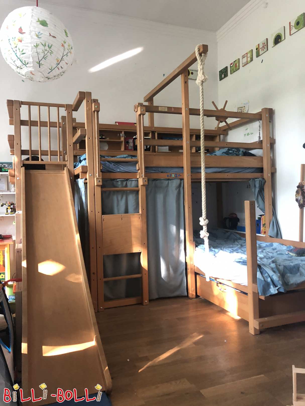 Wir haben das Bett Juli 2009 als mitwachsendes Hochbett (inkl. Kojenbrett und Steuerrad) gekauft und 2013 für unser 2. Kind das Umbauset von Hoch- zu Etagenbett (inkl. Bücherregalen und Vorhangstangen). Seit 2018 wurde das Bett wieder nur als Hochbett genutzt (siehe letztes Foto).