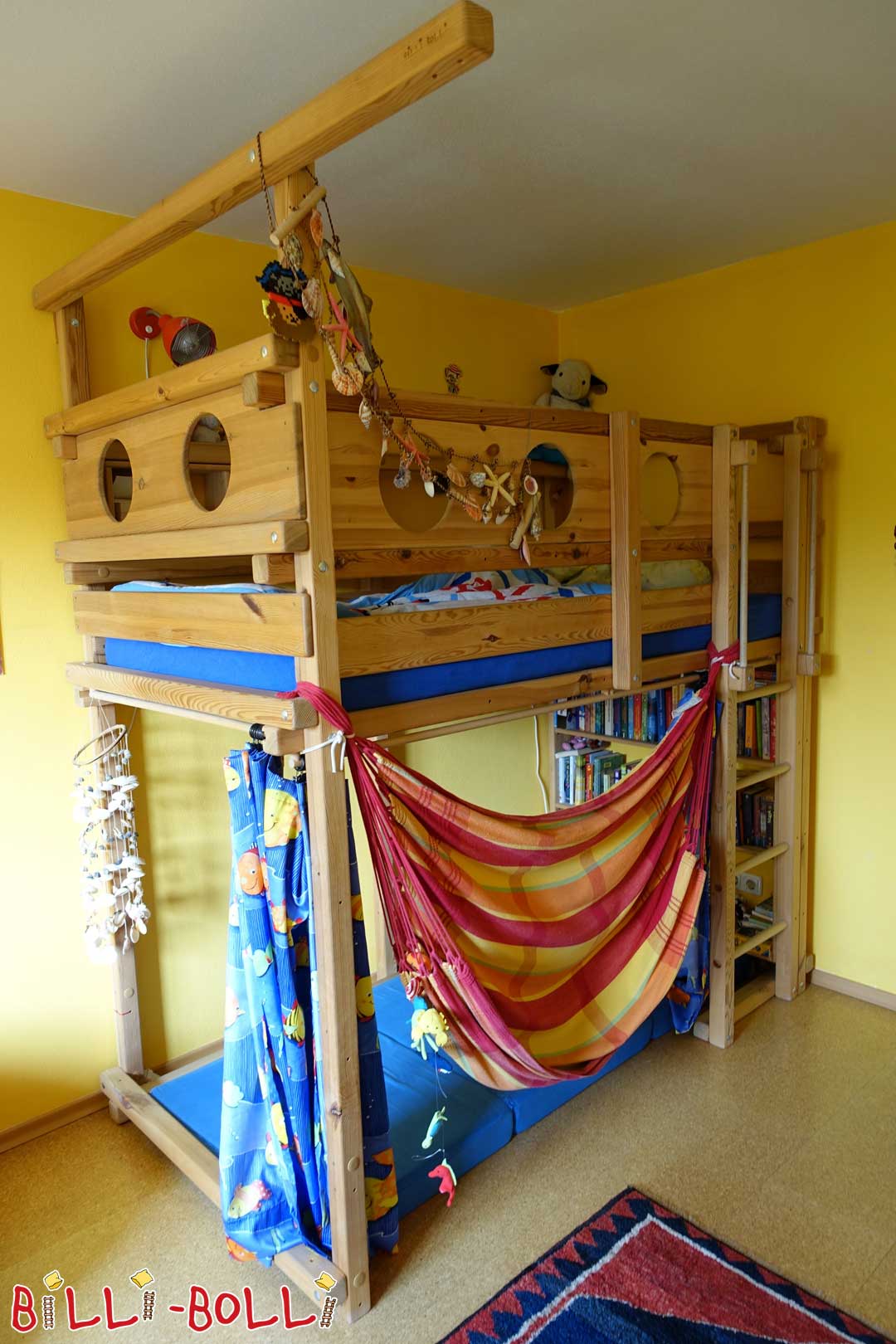 - Etagenbett- Fichte, geölt-gewachst- zwei Lattenroste- zwei (Bücher-/Ablage-) Regale- Kaufladenbrett- zwei Schubkästen für Spiele oder Bettzeug mit Rollen- Kletterseil mit Schaukelteller