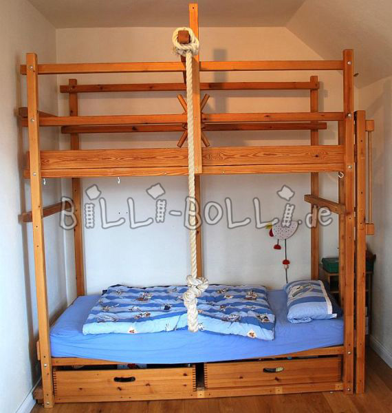 Zubehör: Rutsche, Fichte honigfarben geöltKojenbrett (Bullauge) vorn und fußseitig, Fichte honigfarben geöltKletterseil Naturhanf mit Schaukelteller, Fichte honigfarben geöltSteuerrad, Fichte honigfarben geölt Vorhangstangenset, Fichte honigfarben geöltein kleines Regal, Fichte honigfarben geölt