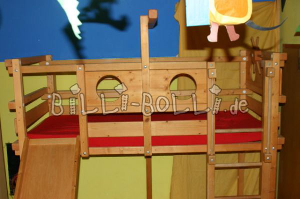 Als Zubehör haben wir ein wandseitiges Kojenbrett, einen Schaukelteller mit Kletterseil (Naturhanf), ein großes Regal sowie ein Vorhangstangenset für 3-Seiten. (Sämtliches Zubehör in Buche geölt).