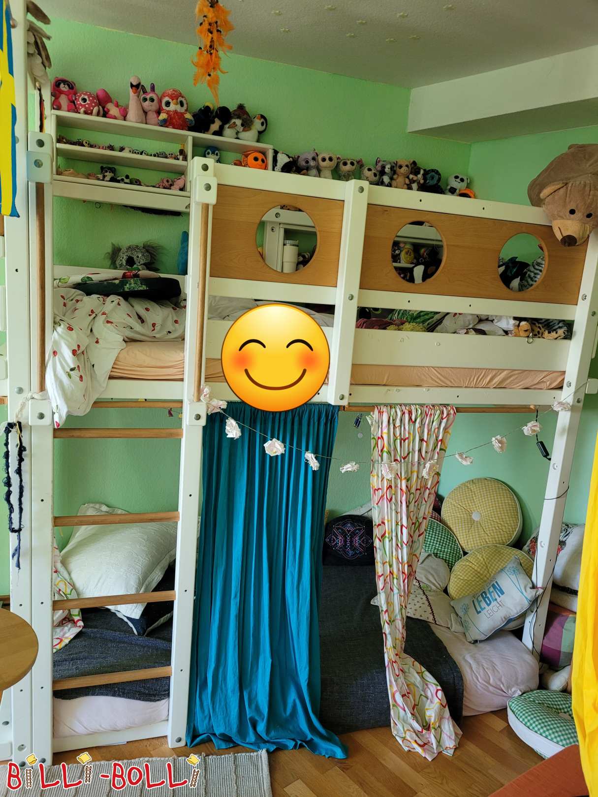 Wir trennen uns schweren Herzens von unserem Hochbett, von 1 Kind benutzt. Der Zustand ist dem Alter entsprechend (das Kind ging sorgsam mit dem Bett um), im Sonnenlicht etwas nachgedunkelt und ein paar kleine Macken.